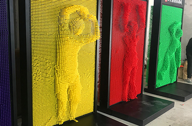 三維針雕人體打印墻有一個(gè)神奇的裝置,像一面墻卻又有很多可以前后活動的小棍子,只要你走近它,將自己的身體用力壓進(jìn)“墻”里,體形輪廓就能在“墻”的另一面凸顯出來。不少游客紛紛慕名前來體驗(yàn)“打卡”走近細(xì)看,發(fā)現(xiàn)這面比略高的長方體“墻”上,許多類似塑料材質(zhì)可以前后活動的小棍子,每個(gè)上都帶有一個(gè)小帽子,這樣構(gòu)成了兩頭粗中間細(xì)的結(jié)構(gòu),可以卡在墻上前后活動。人們在“打印”自己身體時(shí),一些輪廓或部位就完整原來這個(gè)玩意兒只要你用身體使勁壓下去,在另外一面就會“打印出”你的體型輪廓。一些游客說很好玩,一些游客說,打印出來連腰都沒了,也有一些游客對打印出來的身材很滿意。