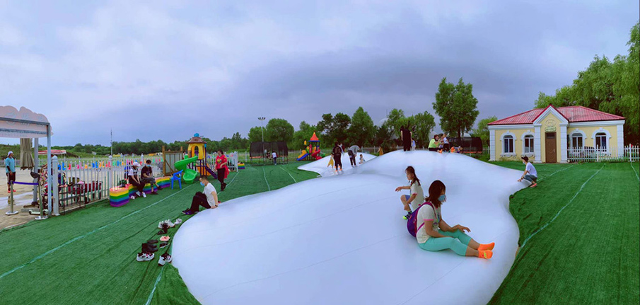 蹦蹦云不僅室內(nèi)室外都能玩,而且產(chǎn)品規(guī)格形式多樣,是完全可以根據(jù)客戶的場地定制的!且還可以自由搭配成各種形狀,只要你想經(jīng)營,只要你有場地,就可以搭建!孩子們可以在上面又蹦又跳的,長此以往,蹦蹦云會不會損壞呢?在這里,需要強調(diào)的是蹦蹦云采用的是雙層膜結(jié)構(gòu),耐磨、抗紫外線。可蹦、可滑、可爬。而且自潔強度高,可保證長期被人踩踏、暴曬、彈跳后,再次清洗后依然清潔!